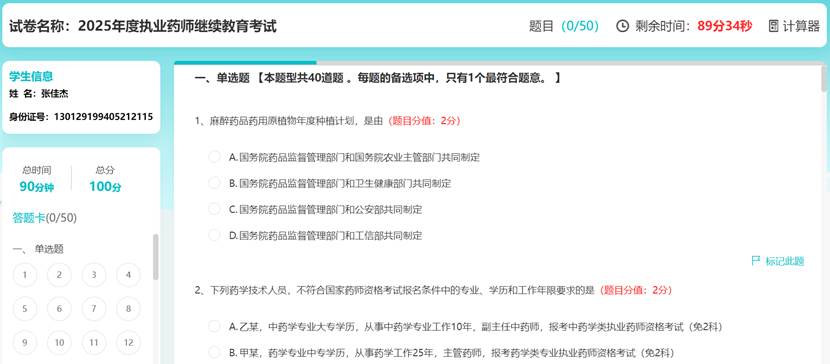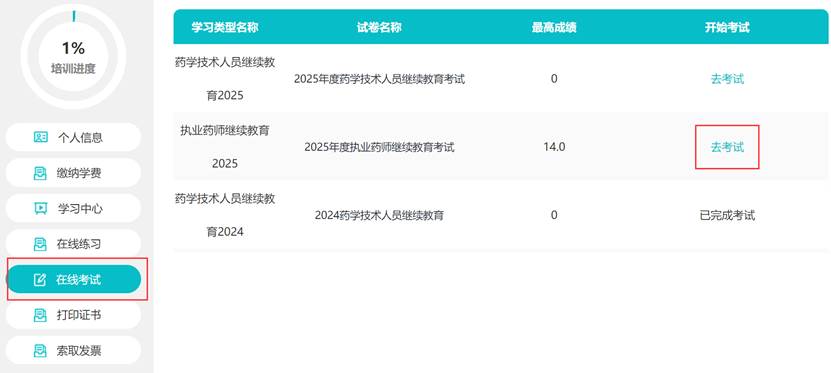 学习规定学时后,进入“在线考试”页面,点击“去考试”,每名学员有5次考试机会。考试题型为单选、多选、判断三种客观题型。
