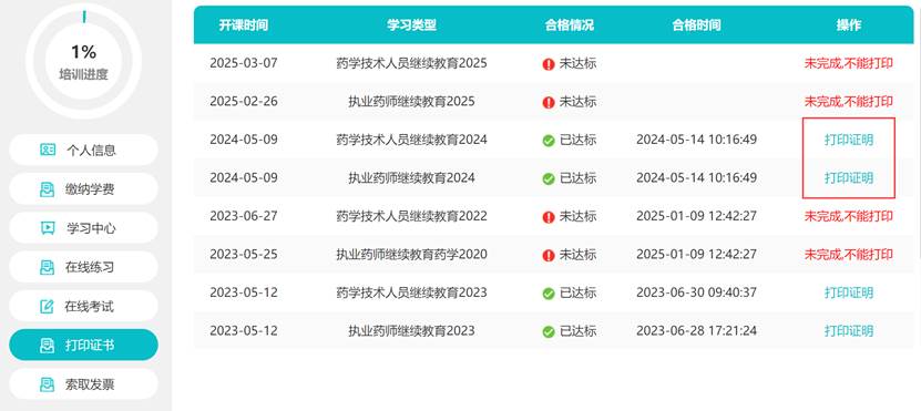 通过考试后,进入“打印证书”页面,点击“打印”系统会跳转至“贵州省药监局宣教中心”网站进行打印