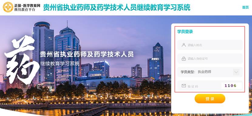 通过贵州省药监局宣教中心官网注册后,进入“正保医学教育网”继续教育学习系统,用“姓名”、“身份证号”和验证码登录。登录后完善个人信息